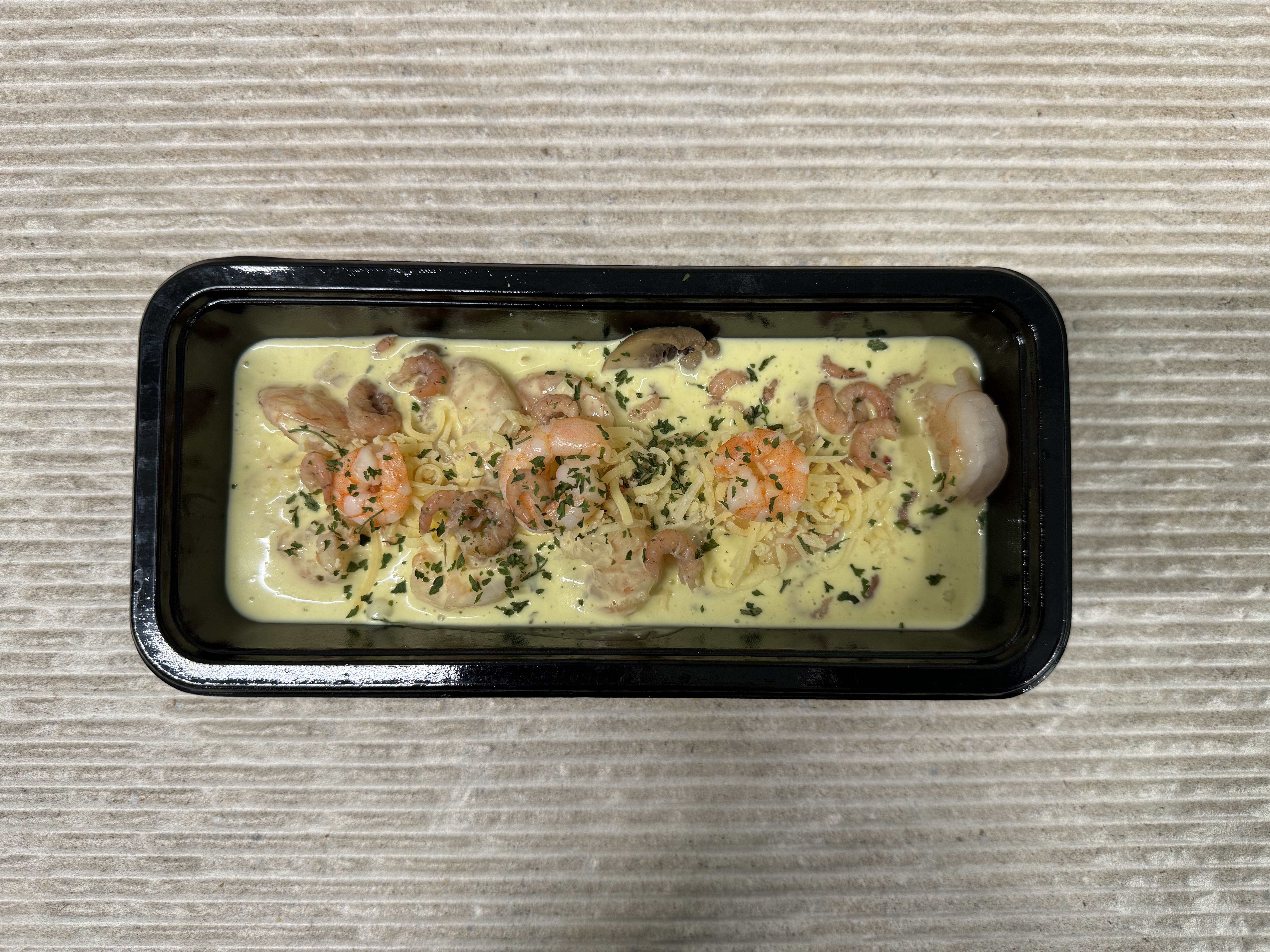 Scampi, grijze garnalen, roze garnalen, champignons, gemalen kaas,gedroogde peterselie, huisbereide kerriesaus